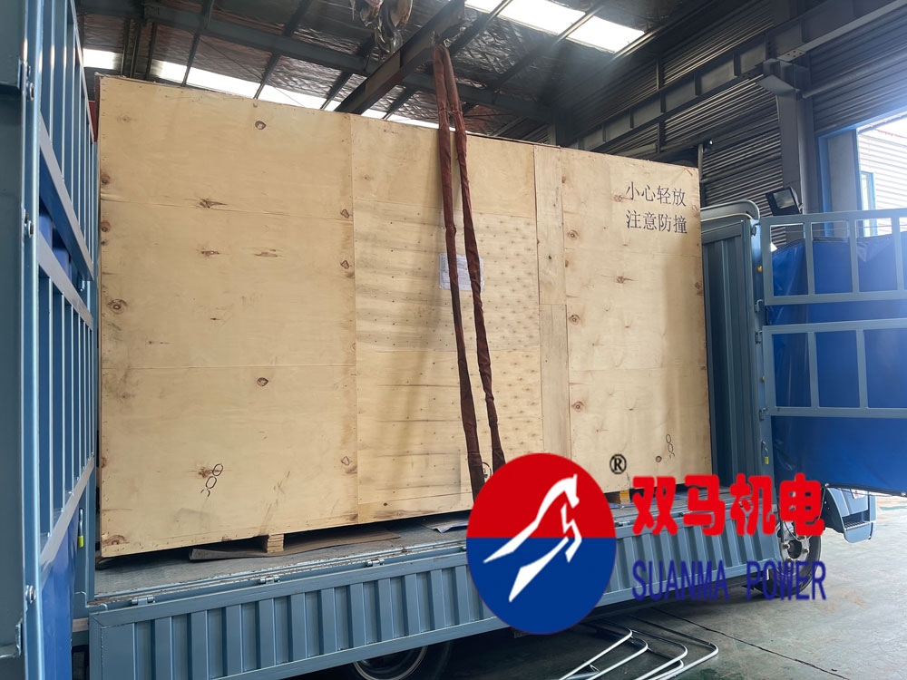 客戶國外項目訂購的800kva今日到工廠提貨裝車發運,800kva濰柴動力木箱包裝后尺寸3850*1720*2320mm,整套機器5000KG.